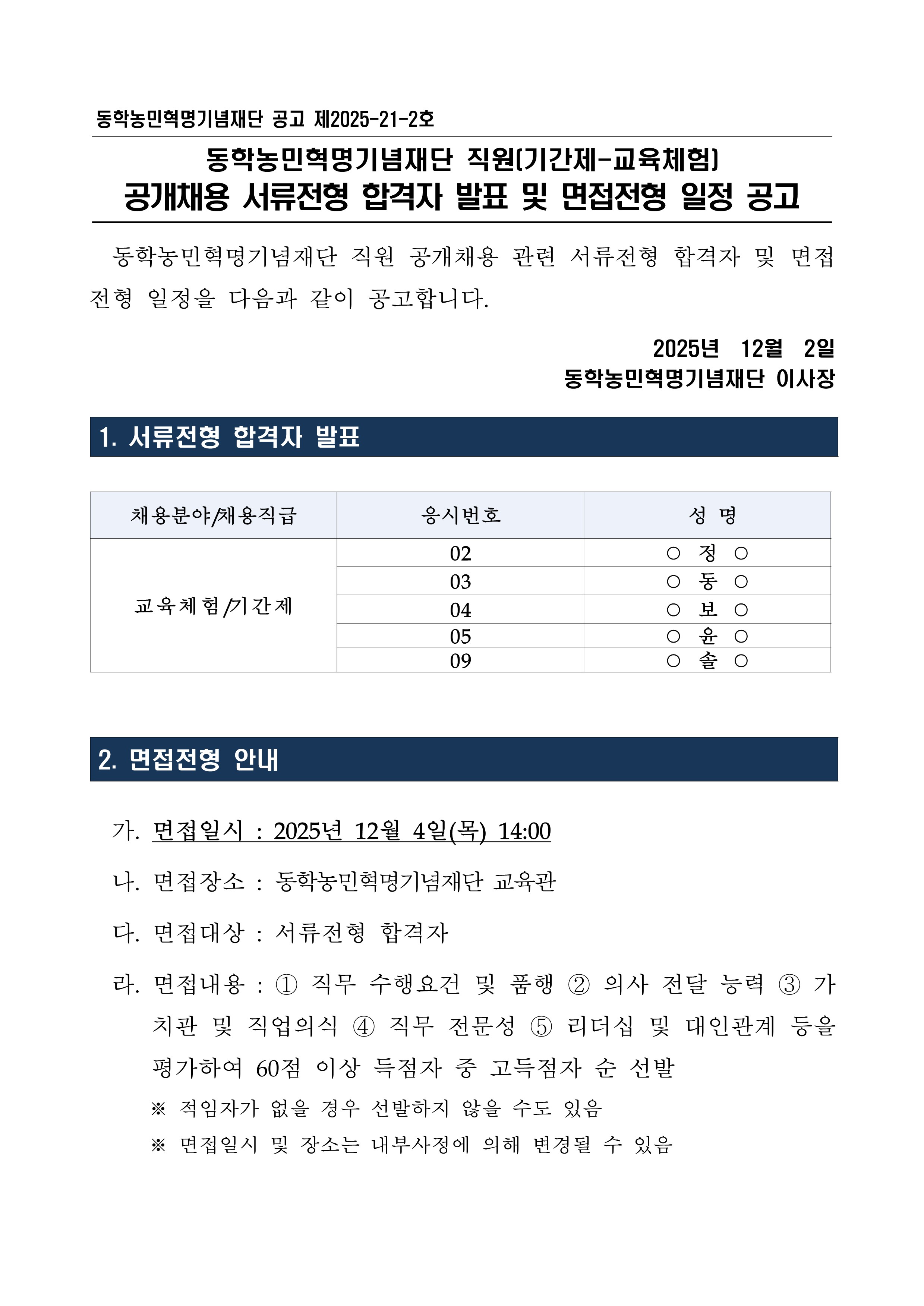 직원 공개채용(기간제-교육체험) 서류전형 합격자 발표 및 면접전형 일정 공고
