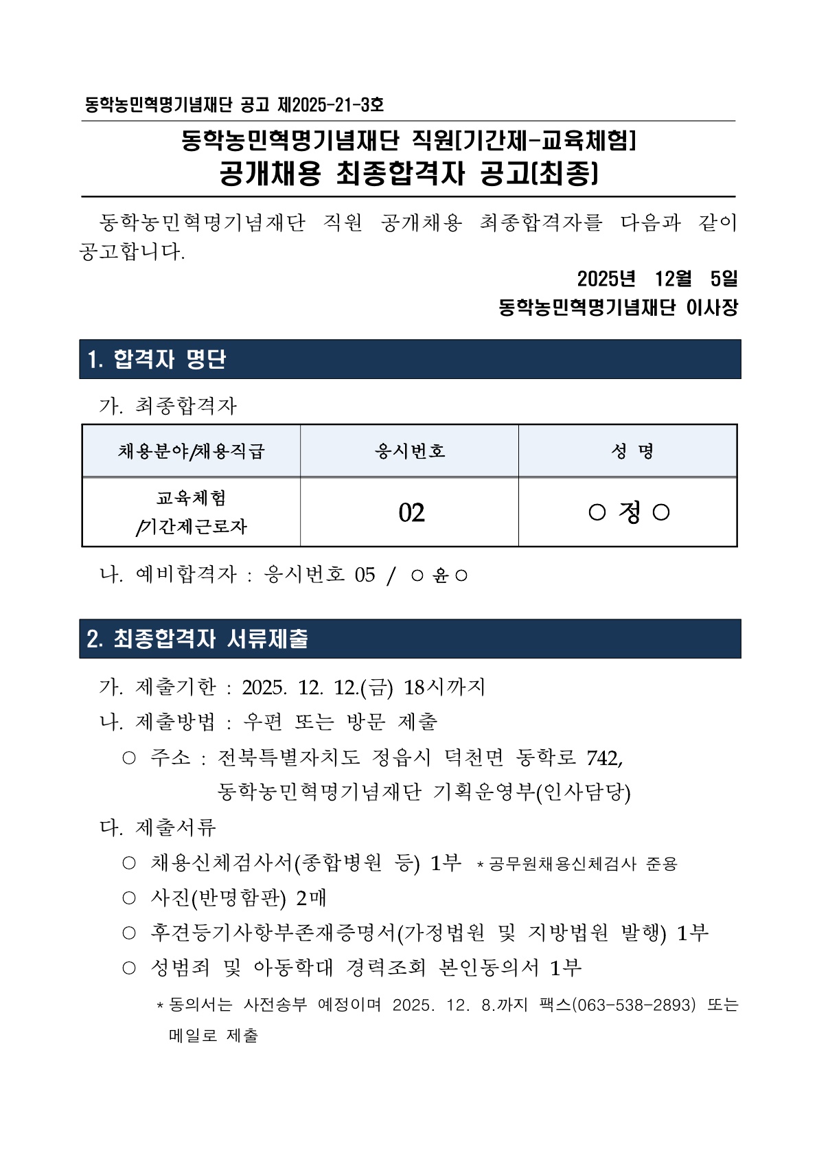 직원 공개채용((기간제_교육체험) 최종 합격자 공고