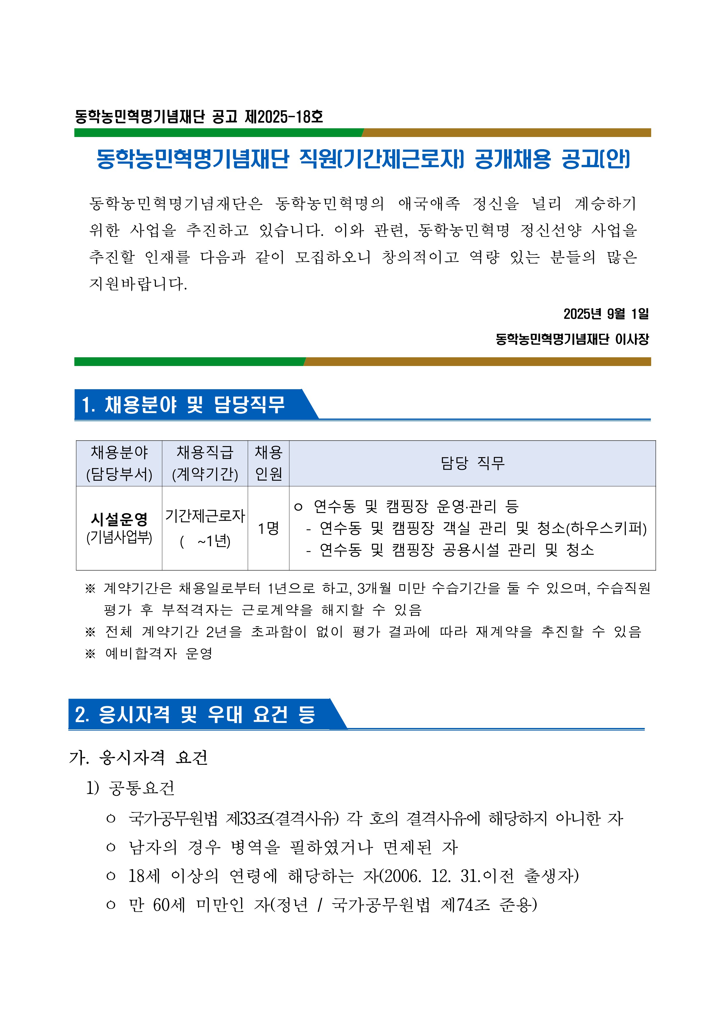 직원(기간제_연수동/캠핑장 시설 운영) 공개채용 공고
