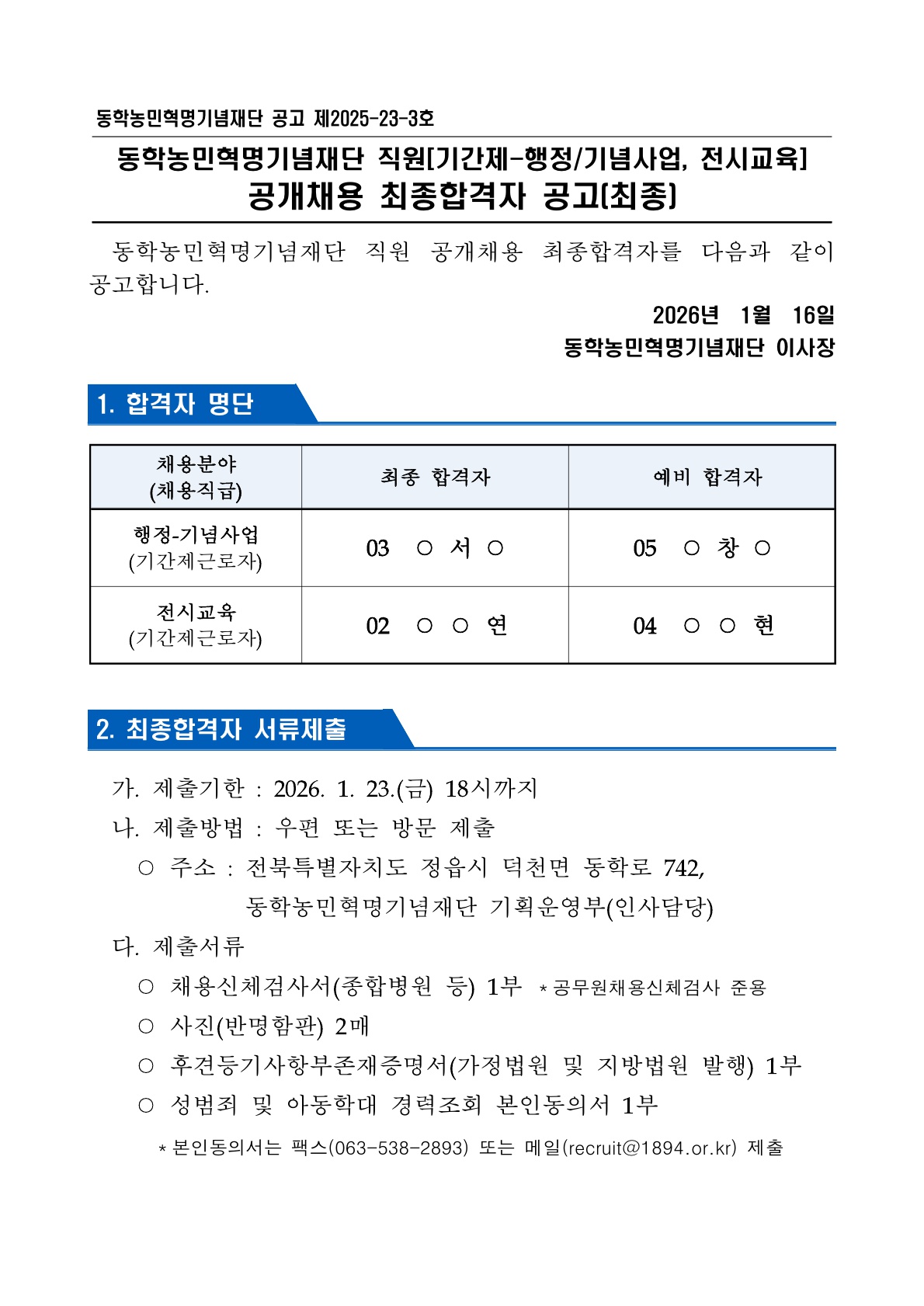 직원(기간제_행정/기념사업, 전시교육) 공개채용 최종 합격자 발표