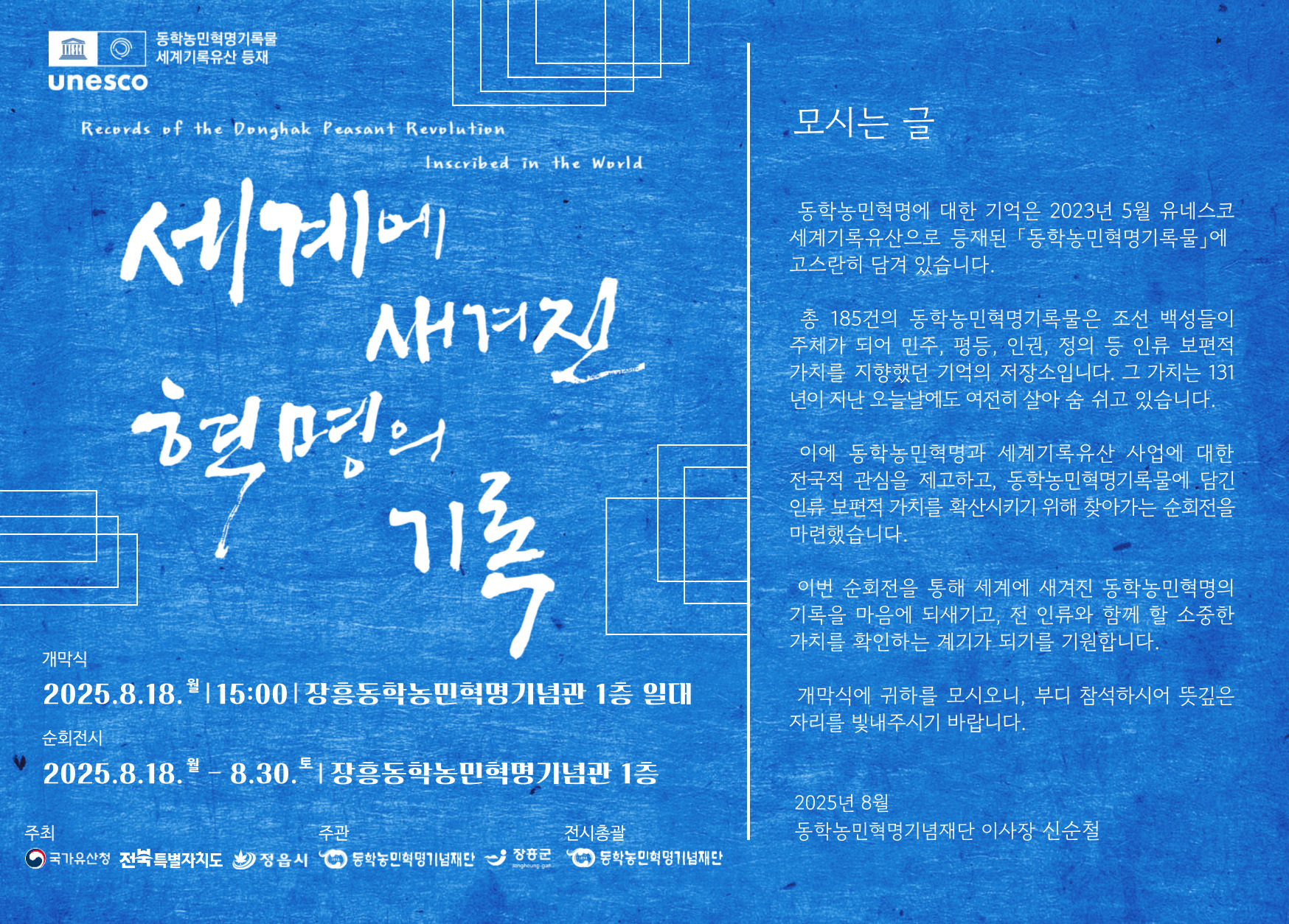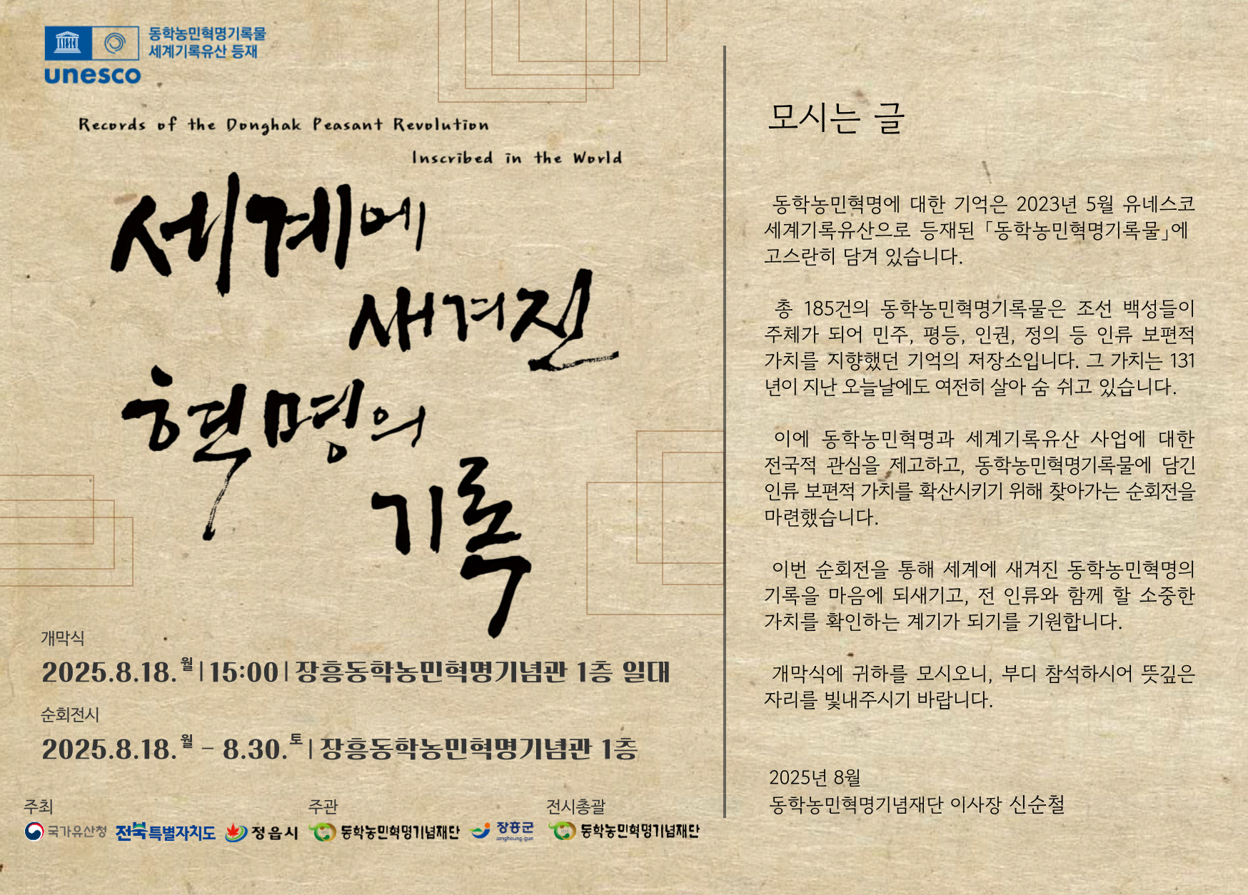 지역을 넘어 유네스코 세계기록유산 ‘동학농민혁명기록물’만난다... 순회전시 시작 - 동학농민혁명기념재단, 2025년 찾아가는 순회전시 ‘세계에 새겨진 혁명의 기록’ 전라권 4개 기관에서 개막 - |