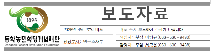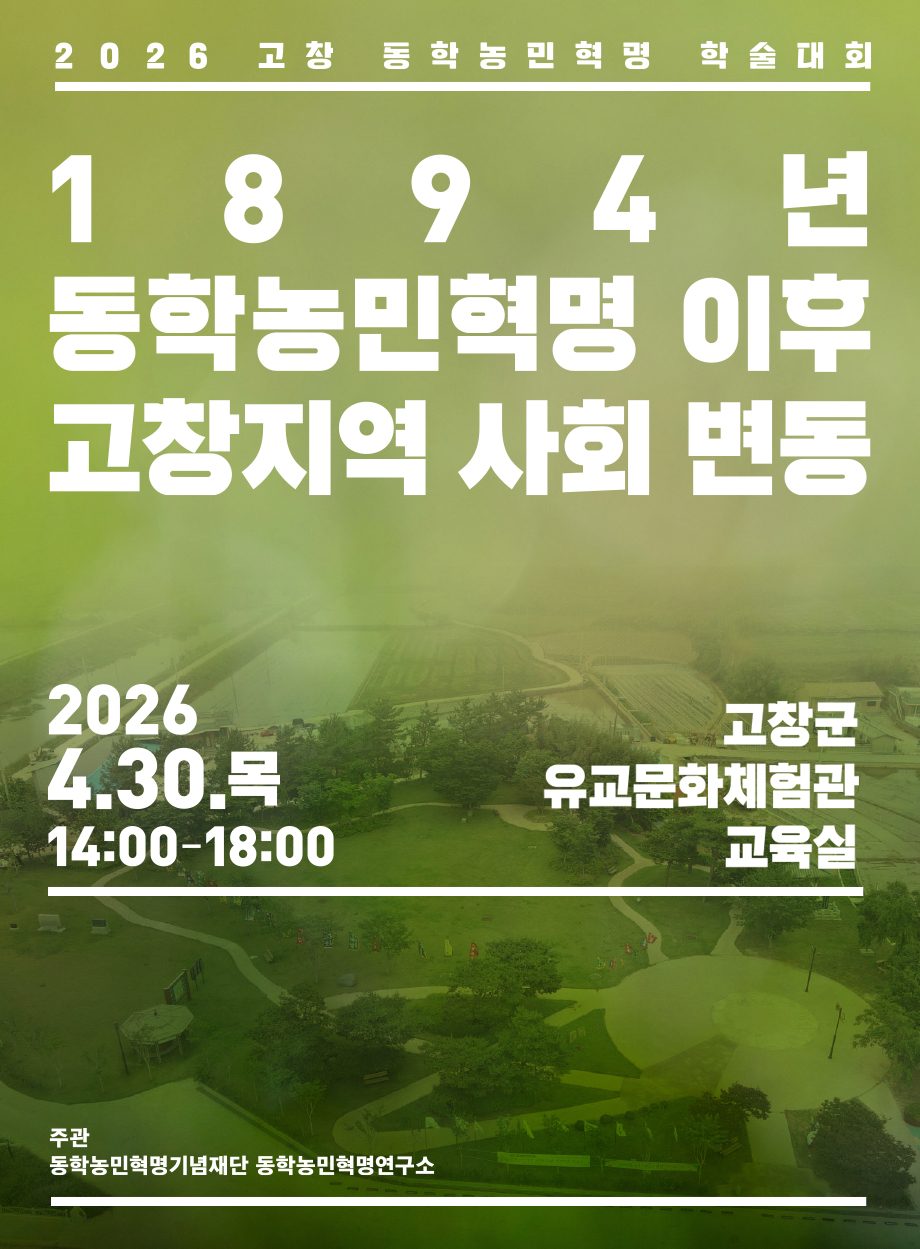 문화체육관광부 특수법인 동학농민혁명기념재단(이사장 신순철)은 오는 4월 30일(목) 오후 2시 고창 유교문화체험관에서 ‘1894년 동학농민혁명 이후 고창지역 사회변동’을 주제로 학술대회를 개최한다고 밝혔다. 이번 학술대회는 재단 산하 동학농민혁명연구소(소장 김양식)가 주관하고 전북특별자치도와 고창군이 후원한다.