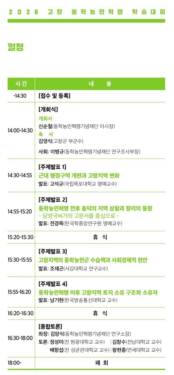 동학농민혁명기념재단 동학농민혁명연구소 김양식 소장은 “이번 학술대회는 혁명을 과거의 정지된 사건에 가두지 않고, 오늘날 고창의 뿌리를 찾는 여정”이라며, “행정, 생활, 토지 등 다양한 지표를 통해 동학농민혁명이 한국 근대사에서 차지하는 실질적인 위상을 확인하고 지역사 연구의 새로운 지평을 여는 자리가 될 것”이라고 강조했다.