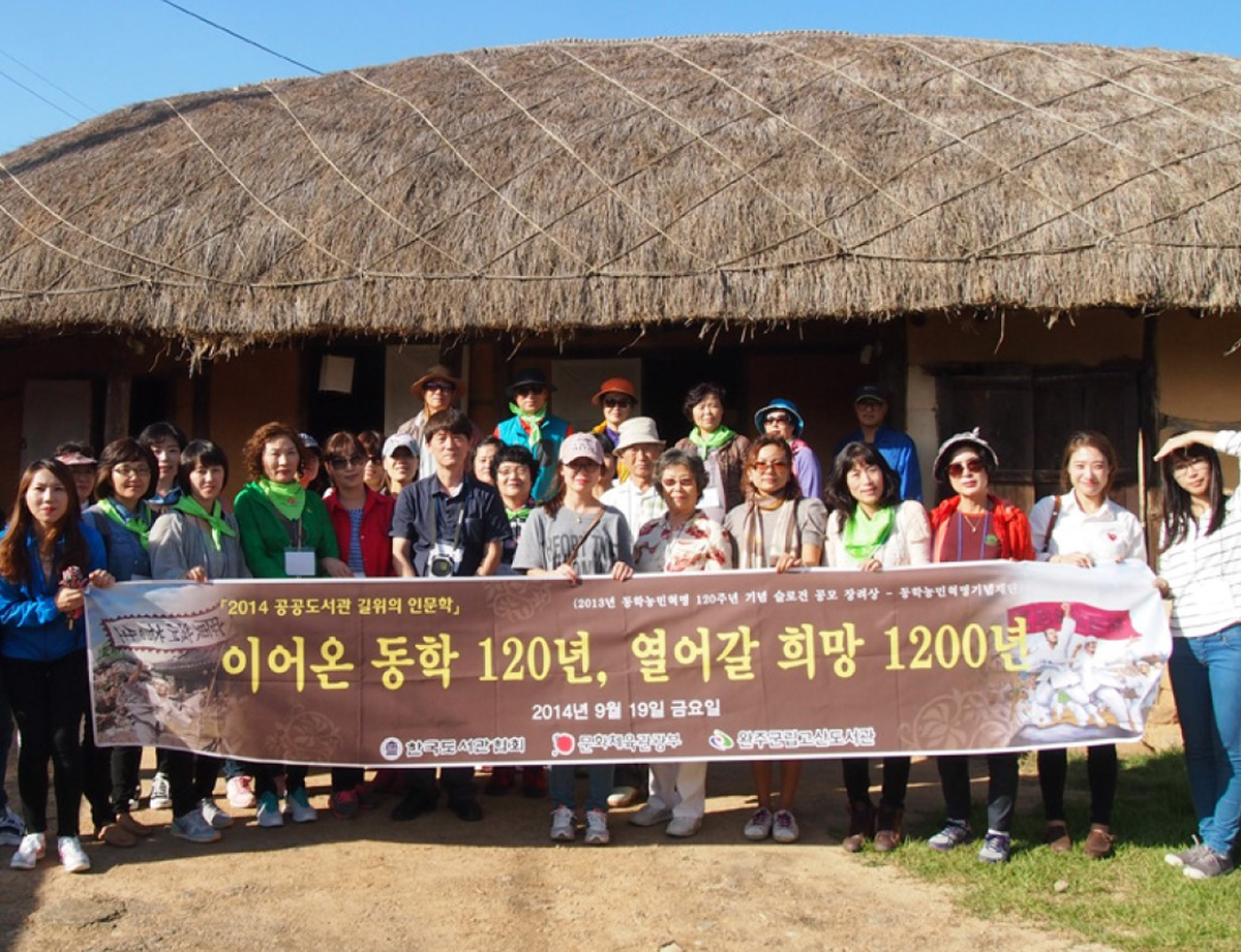 지난 9월 19일(금) 완주 고산도서관에서는 도서관 이용객 등 완주군민 50여명을 대상으로 정읍지역 동학농민혁명 유적지 답사를 실시하였다. 문화체육관광부에서 공모한 ‘길 위의 인문학’사업에 선정되어 진행된 이번 답사는, 동학농민혁명기념재단이 지난 2013년 실시한 ‘동학농민혁명 120주년 기념 슬로건 공모전’에서 장려상을 수상한 ‘이어온 동학 120년, 열어갈 희망 1200년’을 슬로건으로 선정하였다. 이날 참가자들은 동학농민혁명기념관, 고부관아터, 전봉준고택, 말목장터, 만석보터 등 정읍지역 동학농민혁명유적지를 둘러보았다.