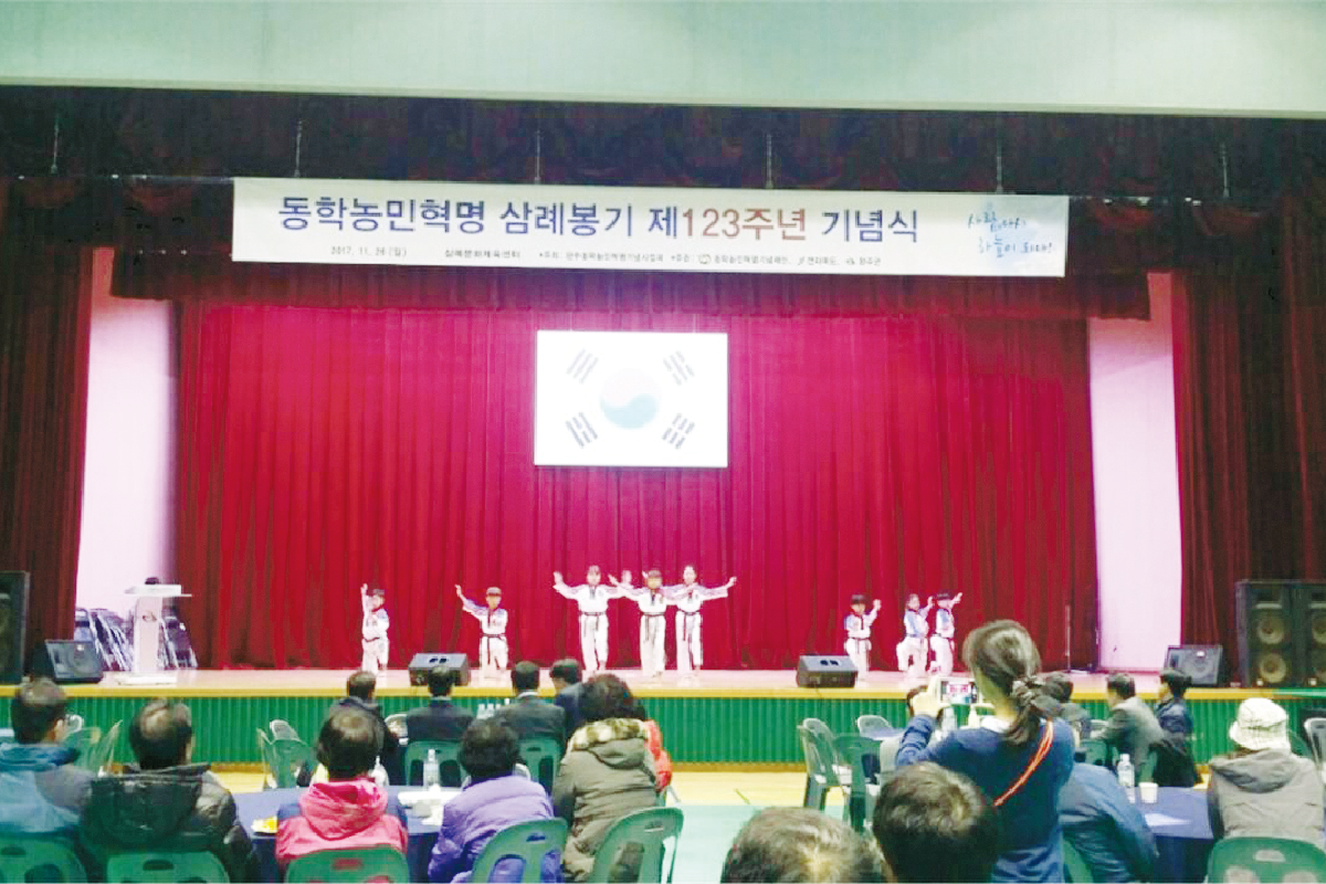완주동학농민혁명기념사업회(회장 김정호)는 11월 26일(일) 전라북도 완주군 삼례읍 동학농민혁명 삼례봉기 역사광장에 자리한 완주군 문화체육센터 대강당에서 ‘동학농민혁명 삼례봉기 123주년 기념대회’를 개최하였다. 문화예술공연과 추모제례, 범군민 걷기대회 등으로 진행된 이날 행사에는 박성일 완주군수, 김춘진 더불어민주당 전북도당위원장, 박재완 전북도의회 의원 등 많은 내외 귀빈과 지역 기념사업단체 임원, 지역 주민 등 300여 명이 참석하여 동학농민혁명 2차 삼례봉기의 역사적 의미를 되새겼다.