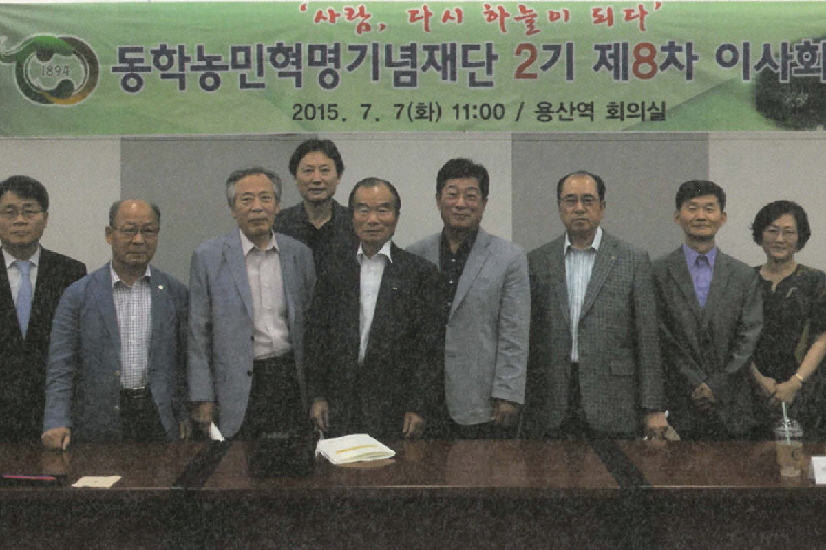 동학농민혁명기념재단 2기 8차 이사회가 지난 7월 7일 용산역 5호 회의실에서 열렸다. 이번 이사회는 전차회의록 보고 후 동학농민혁명 국가기념일제정 추진현황보고, 동학농민혁명 기념공원 추진현황보고, 동학농민혁명기록물 세계기록유산 등재 추진보고, 2015년도 동학농민혁명기념관 위탁(도비) 보조금 추가경정예산 반영보고, 제 121주년 동학농민혁명기념대회 추진현황보고, 동학농민혁명기념재단 신규 운영위원회 구성보고 등 보고안건에 이어 주요사업 추진현황보고로 진행되었다. 이사들은 각 안건에 대해 수정 및 보충이 필요한 사항에 대해 다양한 의견을 제시하는 한편 기념재단의 중추적인 사업들이 한꺼번에 이루어지는 시점인 만큼 사업수행에 있어서 세심한 주의와 함께 각별한 사명감을 가지고 사업을차질 없이 완수해주기 바란다는 뜻을 표했다.