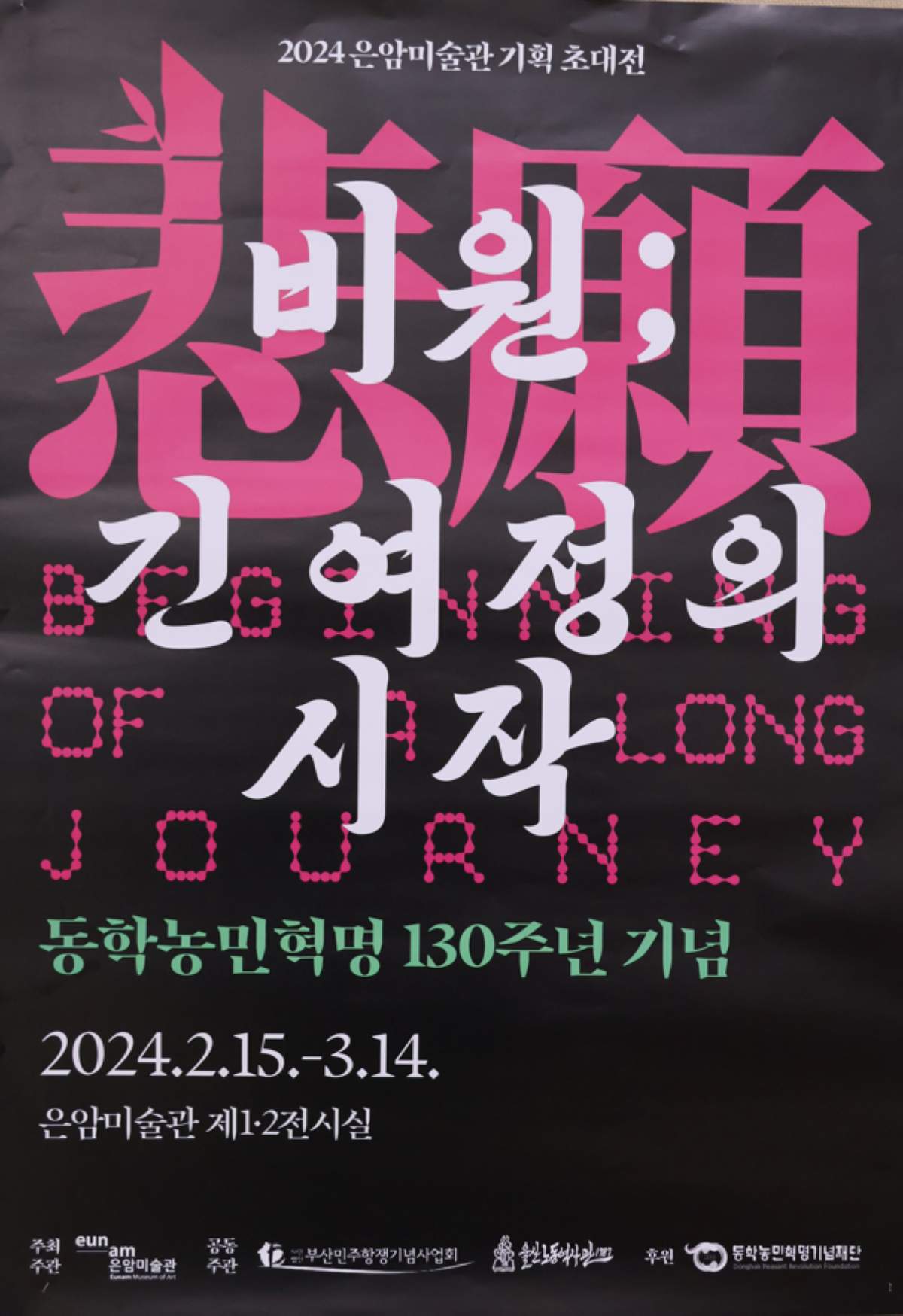 광주광역시 은암미술관(관장 채종기)은 ‘비원(悲願); 긴 여정의 시작’을 주제로 ‘2024 동학농민혁명 130주년 기념전(記念展)’을 열었다. 은암미술관 주최, 부산민주항쟁기념사업회와 울산노동역사관이 공동주관, 동학농민혁명기념재단이 후원한 이번 기념전에는 대한민국 미술계에서 활동하는 민중미술 작가 17명이 참여, 우리나라 민족민주운동의 시원(始原) 동학농민혁명의 역사를 판화, 회화, 설치, 영상, 퍼포먼스 등 다양한 장르와 매체로 형상화하였다. 기념전은 광주광역시 전시에 이어 3월~5월 울산노동역사관, 6월~7월 부산민주공원에서 각각 전시한다.