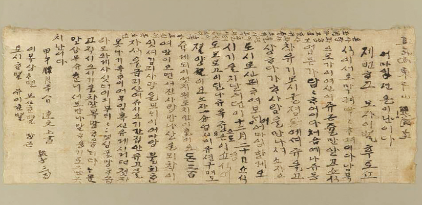 제번하고 모자 이별 후로 소식이 서로 막혀 막막하였습니다. 남북으로 가셨으니 죽은 줄만 알고 소식이 없어 답답하였습니다. 처음에 나주 동창 유기모 시굴점에서 죽을 고생을 하다가 한 사람을 만나서 조자의 토시로 신표를 하여 보내어 어머님 함께 오시길 기다렸더니, 12월 20일 소식도 모르고 이날 나주옥으로 오니 소식이 끊어지고 노자 한 푼 없으니 우선 굶어죽게 되니 어찌 원통치 아니 하리오. 돈 300여량이 오면 어진 사람 만나 살 묘책이 있어 급히 사람을 보내니 어머님 불효한 자식을 급히 살려주시오. 그간 집안 유고를 몰라 기록하니 어머님 몸에 혹 유고 계시거든 옆 사람이라도 와야 하겠습니다. 부디부디 명심불망하옵고 즉시 오시기를 차망 복망하옵니다. 남은 말씀 무수하니 서로 만나 말 하옵기로 그만 그치나이다.