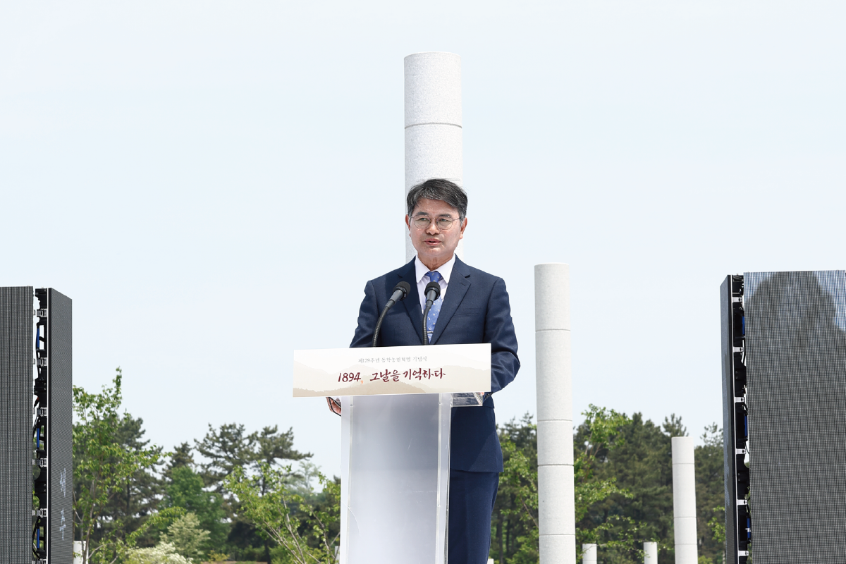 오늘은 동학농민혁명 제129주년이 되는 날입니다. 먼저 삼가 동학농민군 선열님들의 명복을 빕니다. 아울러 동학농민혁명 참여자 유족 여러분께 깊은 경의와 감사의 인사를 드립니다. 또한 동학농민혁명 참여자와 유족의 명예 회복을 위해 늘 힘써 주시는 동학농민혁명유족회 주영채 회장님, 천도교 주용덕 종무원장님, 동학농민혁명기념재단 신순철 이사장님과 유관 단체 대표님들과 관계자 여러분께도 감사드립니다. 그리고 동학농민혁명 정신 선양 사업에 뜻을 같이해주신 국회 윤준병 의원님, 전라북도 임상규 행정부지사님, 이학수 정읍 시장님, 오늘 자리를 빛내주고 계신 내빈 여러분께도 감사의 마음을 전합니다.