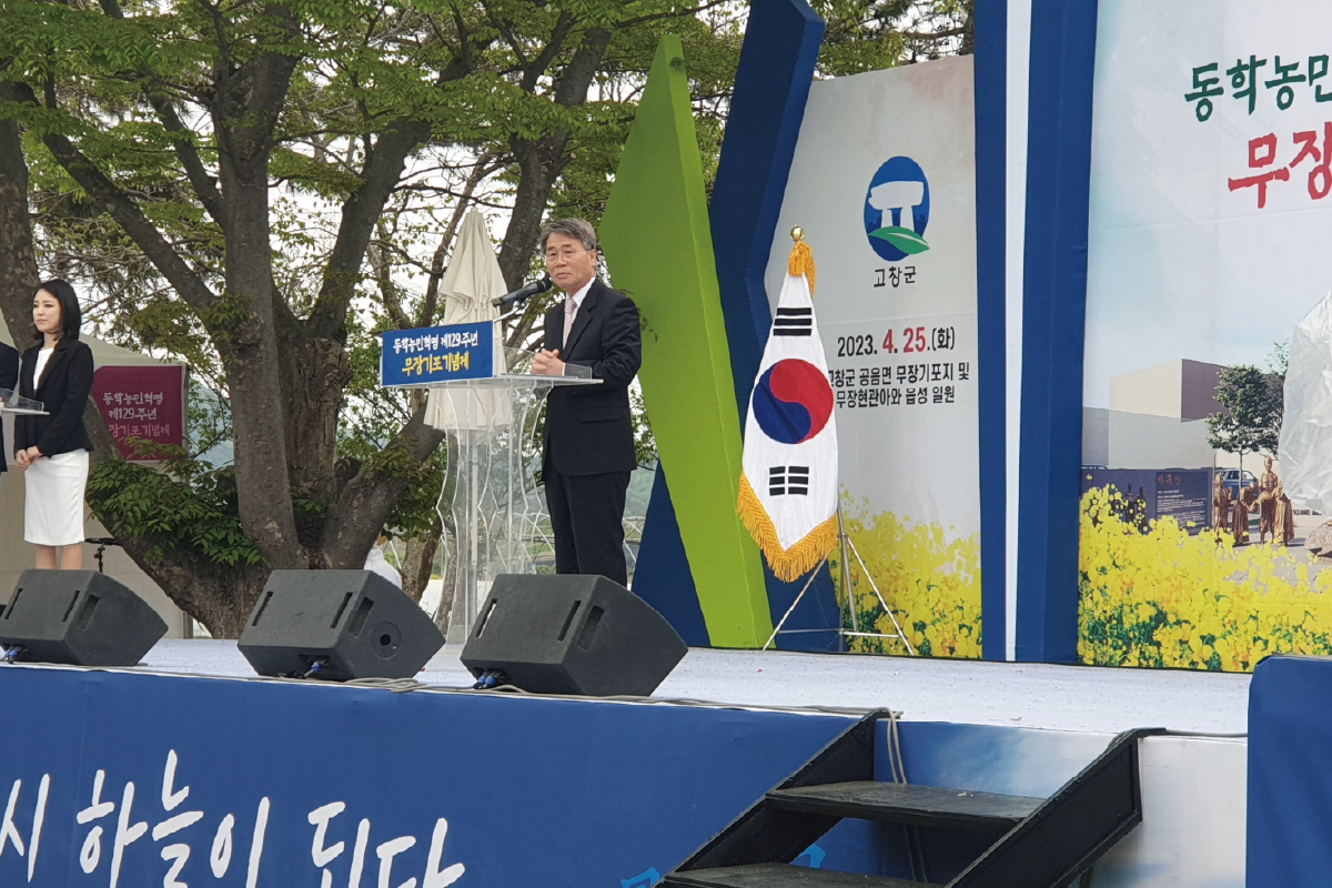 지난 4월 25일 고창군 공음면 동학농민혁명 무장기포지(국가지정문화재) 일원에서 제129주년 동학농민혁명 무장기포 기념제가 (사)고창동학농민혁명기념사업회(이사장 진윤식) 주관으로 펼쳐졌다. 국민의례, 대회사, 축사, 기념공연, 제16회 녹두대상 시상, 동학농민군 진격로 걷기, 무장읍성 입성재연으로 전개된 기념제에는 심덕섭 고창군수, 임정호 고창군의회 군의장, 김만기 전라북도의회 부의장, 신순철 동학농민혁명기념재단 이사장, 주영채 (사)동학농민혁명유족회 이사장을 비롯하여 동학농민혁명 참여자 유족 및 고창군민 1천여 명이 참석하였다.