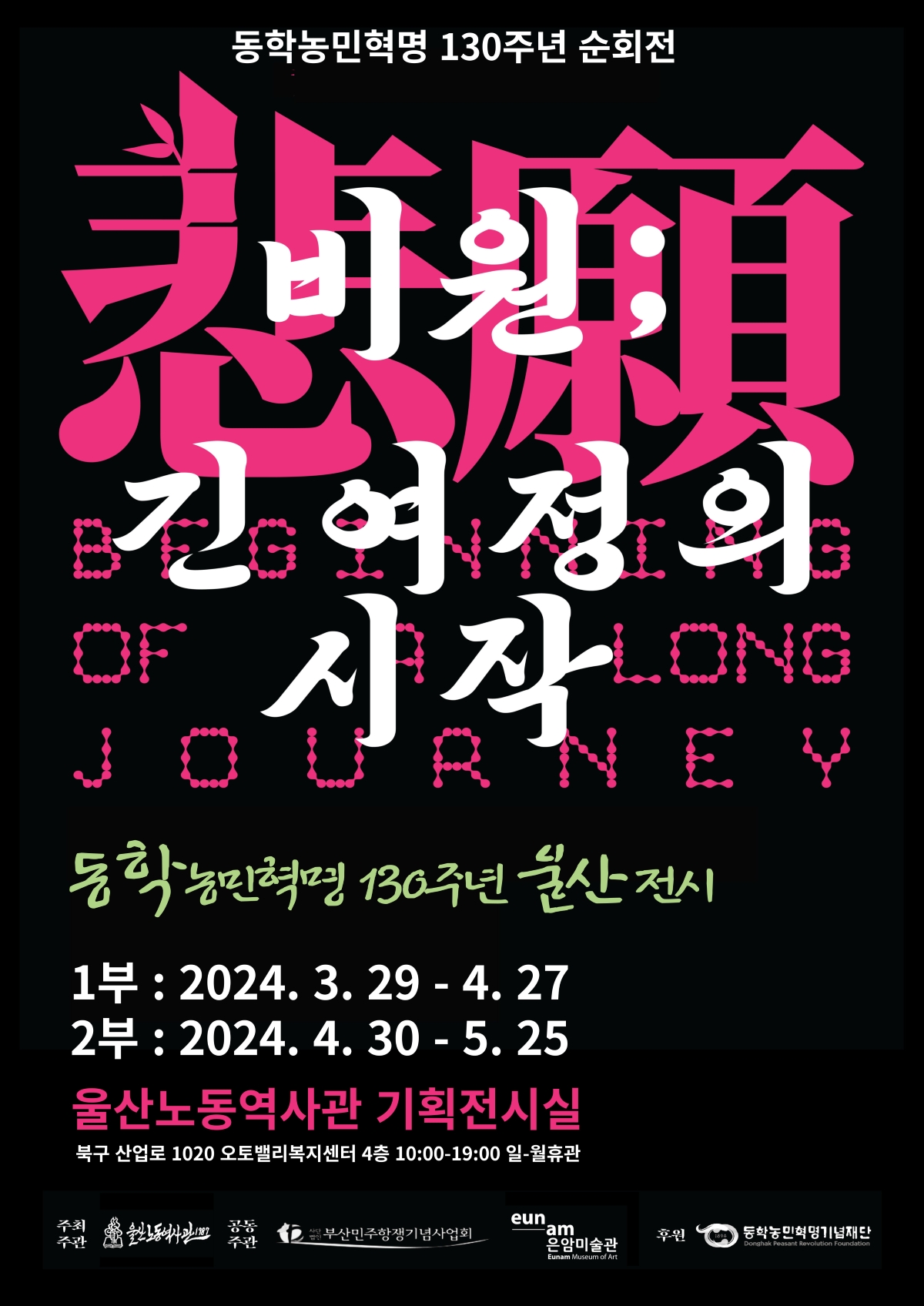 1994년 20대 딴따라 첫길에 맞은 동학농민혁명이 30년 비나리를 거쳐 2024년 시골큐레이터의 그림굿으로 이어졌다. 동학농민혁명으로 서른 해를 아팠다. 아팠던 이가 아픈 이를 낫게 한다. 무당은 먼저 아팠던 사람이다. 먼저 아팠던 사람이 이제 아픈 아픈 사람을 낫게 하는 것이다. 1894년에서 비롯하여 1994년을 거쳐 2024년에 마련한 시골큐레이터의 동학농민혁명 전시는 치유된 치유자가 그리는 그림굿이다. 동학농민혁명 130주년 기념전시를 채비하는 큐레이터는 설레고 두려웠다. 2023년부터 전국 순회전을 꿈꾸며 차근차근 채비하였다. 딴따라로 참여해서 당시 현장을 보진 못했지만 도록(圖錄)으로 본 100주년 기념전시는 그 규모가 엄청났다. 답사-전시-연계 공연으로 이루어진 순회전시의 틀, 다양한 형상화 방식을 수용한 작품의 구성은 130주년 전시를 채비하는 큐레이터에게 좋은 전범이 되었다.