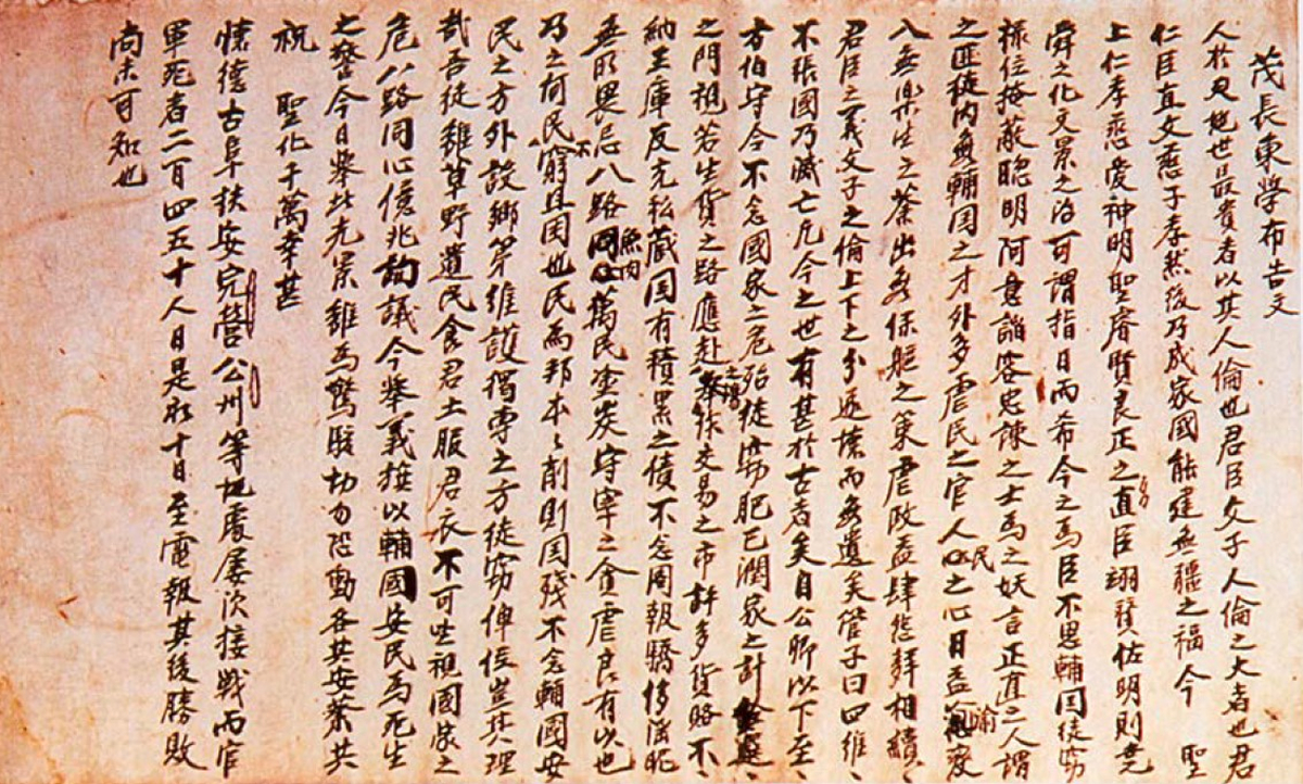 우리들은 비록 초야(草野)의 유민(遺民)이지만 임금의 땅에서 농사지어 먹고 임금이 준 옷을 입고 살아가고 있으니 가히 앉아서 나라의 위태로움을 보고만 있을 수 없어, 온나라가 마음을 같이 하고 억조창생(億兆蒼生)이 머리를 맞대고 의논하여 이제 의기를 들어 ‘보국안민(輔國安民)’으로서 죽고 사는 맹세를 하노니, 오늘 이러한 광경은 비록 놀랄만한 것이지만 절대로 두려워하거나 움직이지 말고 각자 자신의 생업에 편안히 종사하여 모두 태평성대를 축원하고 다 함께 성군(聖君)의 교화를 누릴 수 있다면 천만다행이겠노라.