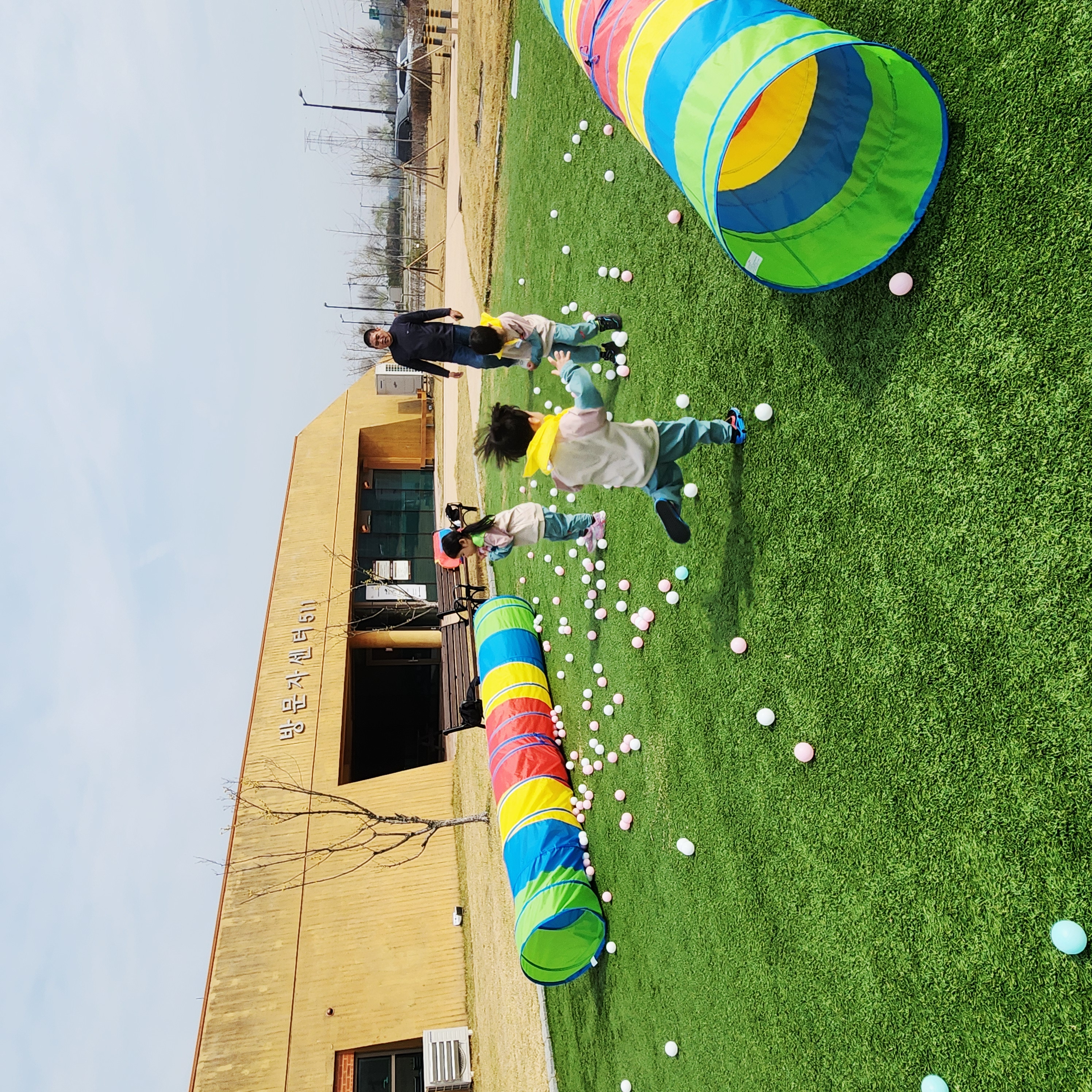 ▣ 교육내용: 봄에 피는 꽃 찾기(민들레, 봄까치꽃), 터널 지나기, 공 줍기 등