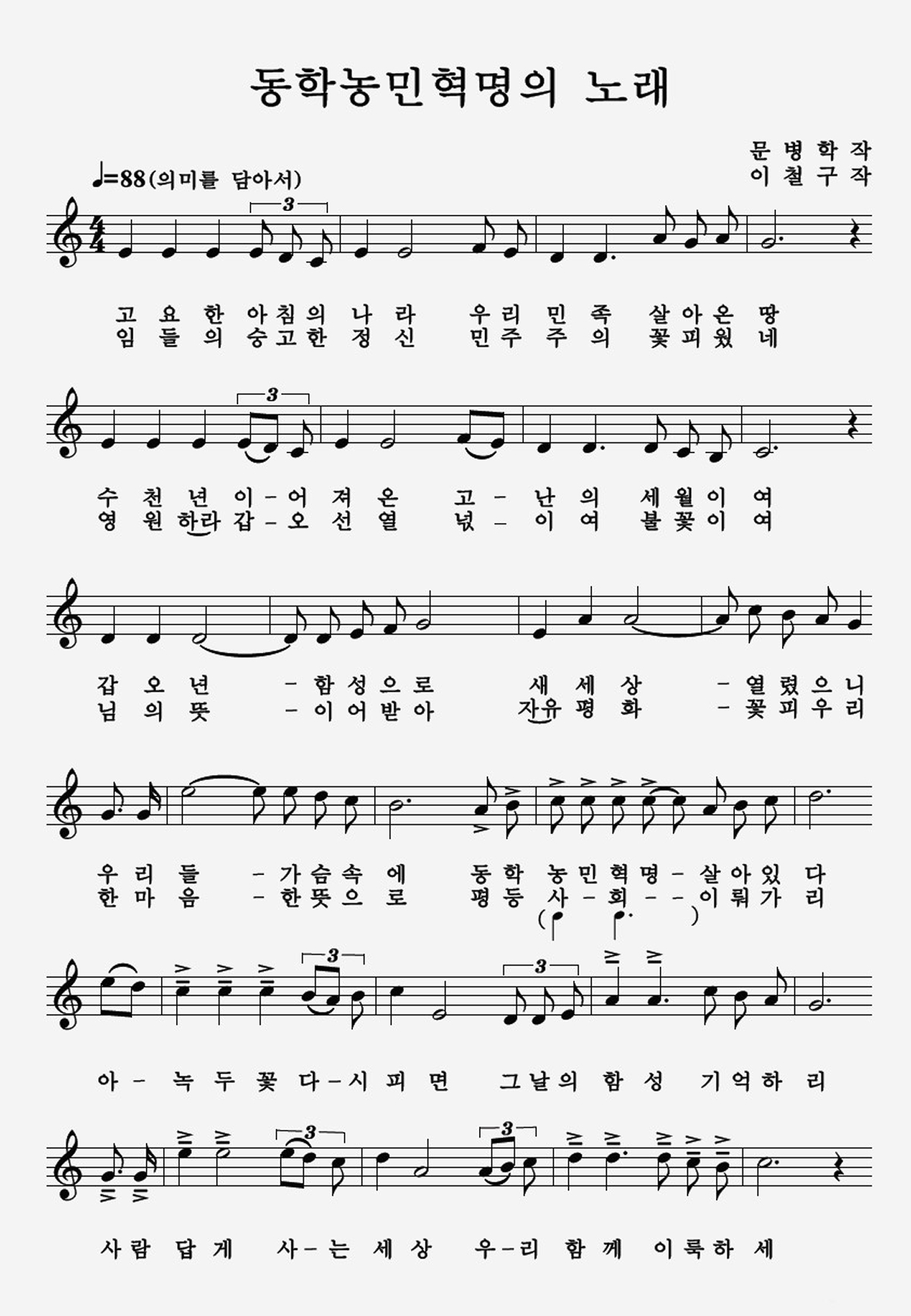 동학농민혁명과 관련된 노래를 떠올려보면 ‘새야 새야 파랑새야’하는 가사와 함께 멜로디가 떠오를 것이다. 물론 민요 ‘새야 새야’가 동학농민혁명을 대표하는 곡이라고 할 수는 있지만, 기념하는 곡이라고 하기에는 다소 무리가 있다.