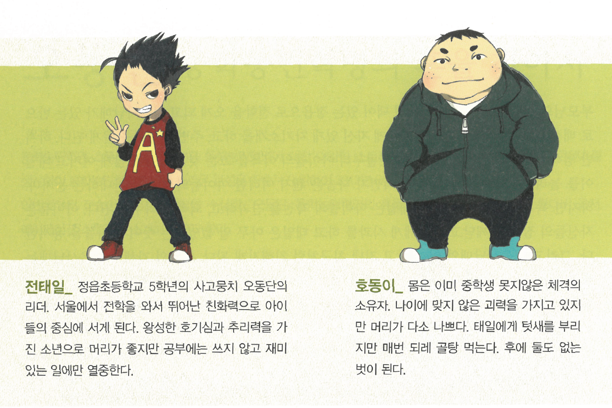 시간이 흘러 현재의 정읍초등학교 교실. 여느 초등학교와 다를 바 없는 아이들의 웃음소리와 교실 바닥이 쿵쿵 거리는소음이 들린다. 교실에는 항상 손에서 책을 놓지 않는 전교 1등 명석이와 또래 아이들보다 덩치가 두 배는 큰 호동이가 자리 잡고 있고, 그 옆에서 말없이 모자를 눌러쓰고 앉아 있는 에디와 그들 중 유일한 홍일점 다솜이가 보인다. 이 네 명은 유치원 때부터 친하게 지내오던 소꿉친구들로 항상 붙어 다녀서, 주변 사람들로부터 정읍사남매라고 불려왔다. 그러던 어느 날 서울에서 전태일이라는 전학생이 그들의 교실로 오게 된다. 태어나서 쭉 서울에서만 자란 태일이는 부모님의 사정으로 인해 할아버지 댁이 있는 정읍으로 전학을 오게 되고 정읍사남매가 있는 반으로 배정 받는다. 태일이는 아이들에게 자신 있게 자기소개를 하고, 주변의 이목을끌게 된다. 하지만 명석, 호동이, 에디는 전학생이 첫날부터 아이들의 이목을 끄는 것을 달갑지 않게 여기고 태일이를 놀려주기로 계획을 세운다. 어쩐지 다솜은 왠지 이러한 아이들의 계획을 반대하는 눈치다. 하지만 똑똑하고 눈치가 빠른 태일은 아이들의 작전을 간파하고, 되려 놀려주게 된다. 아이들은 자신들의 잘못을 깨닫고 태일에게 사과를 하고 태일은 아무 일 없었다는 듯이 아이들을 용서한다. 그리고 정읍사남매와 이미 알고 지낸 천구처럼 친해지게 된다. 태일의 가세로 정읍사남매는 일명 오동단으로 불리며, 각종 사건사고를 일으키는 말썽꾸러기로 자리매김한다.