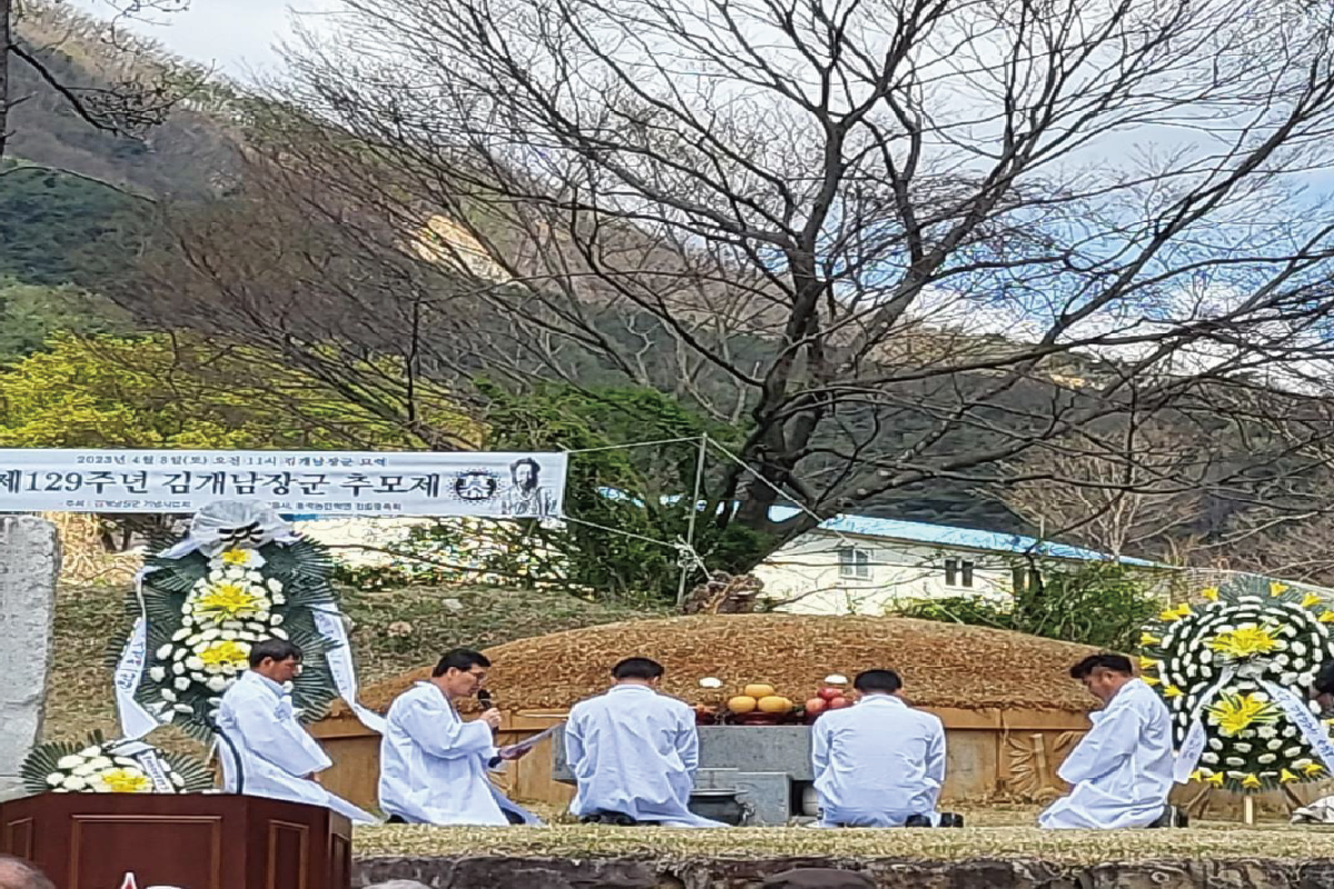 지난 4월 8일 전북 정읍시 산외면 김개남 장군 묘역에서 김개남장군기념사업회(회장 김호영)의 주최로 김개남 장군 순국 129주기 추모제가 거행되었다. 동학농민혁명 지도자 김개남 장군을 기리는 이번 추모제는 풍물패의 길놀이를 시작으로 국민의례, 개회사, 추모사, 고천문 낭독, 재배·분향·헌화 순으로 진행되었다.