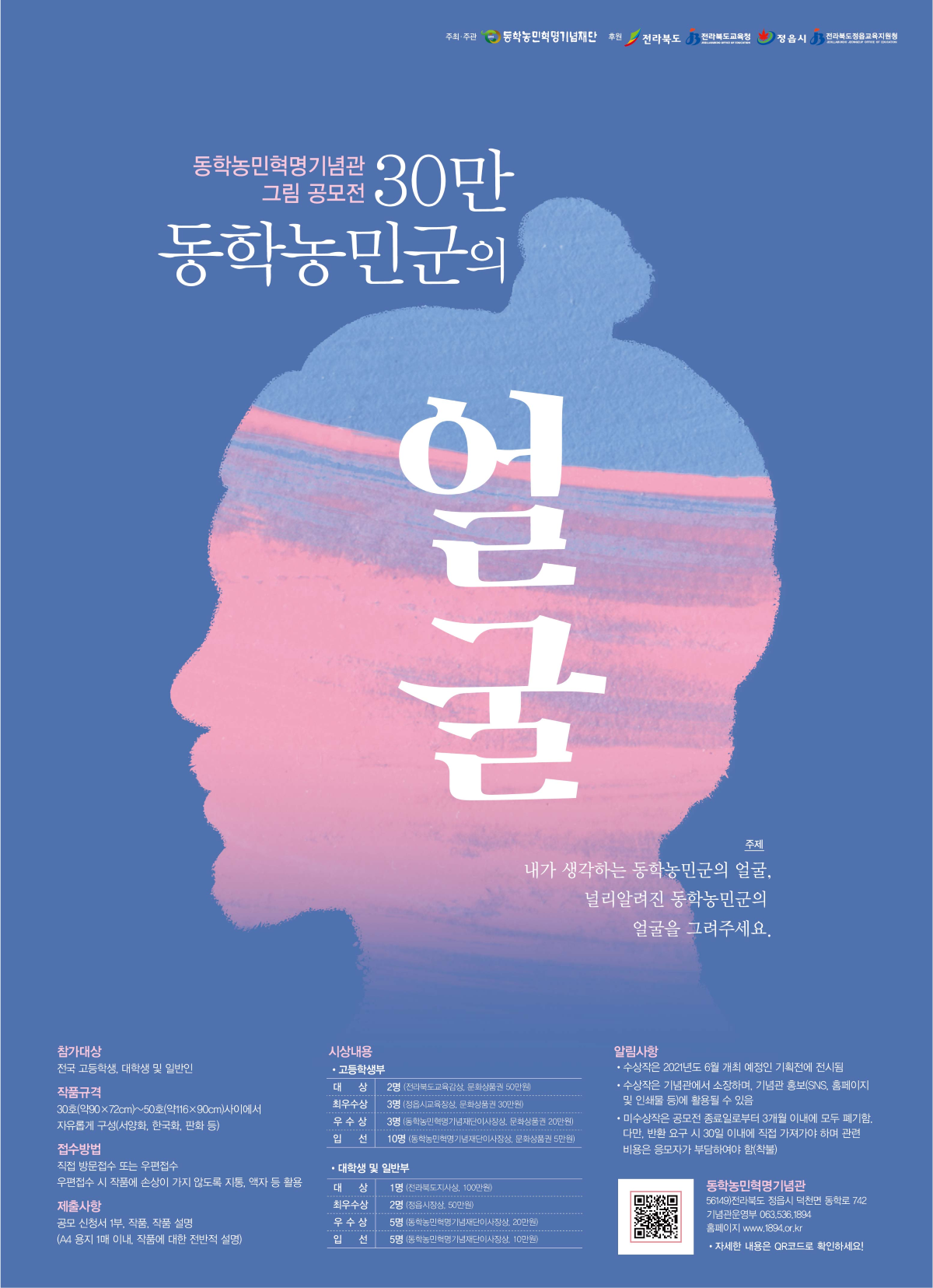 공모전은 4월 12일부터 6월초까지 전국의 고등학생, 대학생 및 일반을 대상으로 진행되었다. ‘내가 생각하는 동학농민군의 얼굴’이나 ‘널리 알려진 동학농민군의 얼굴(모사)’ 중 한 가지를 선택하여 서양화, 한국화, 판화 등의 작품을 공모하였다. 공모전에는 총 40점의 작품이 출품되어 27점이 수상작으로 선정되었다.
