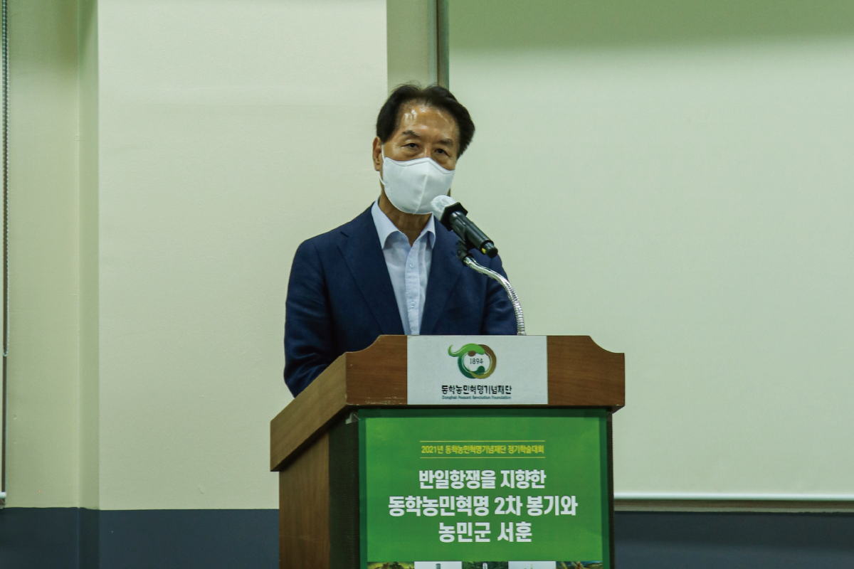 지난 7월 21일 동학농민혁명기념재단 주최, 문화체육관광부 후원으로 ‘반일항쟁을 지향한 동학농민혁명 2차 봉기와 농민군 서훈’이라는 주제 아래 2021 동학농민혁명기념재단 정기학술대회가 열렸다. 코로나19 확산 방지를 위해 유튜브 생중계(채널: 동학농민혁명기념재단)로 진행된 이날 학술대회는 이형규 동학농민혁명기념재단 이사장의 대회사, 주영채 동학농민혁명유족회 회장의 축사로 시작되었다.