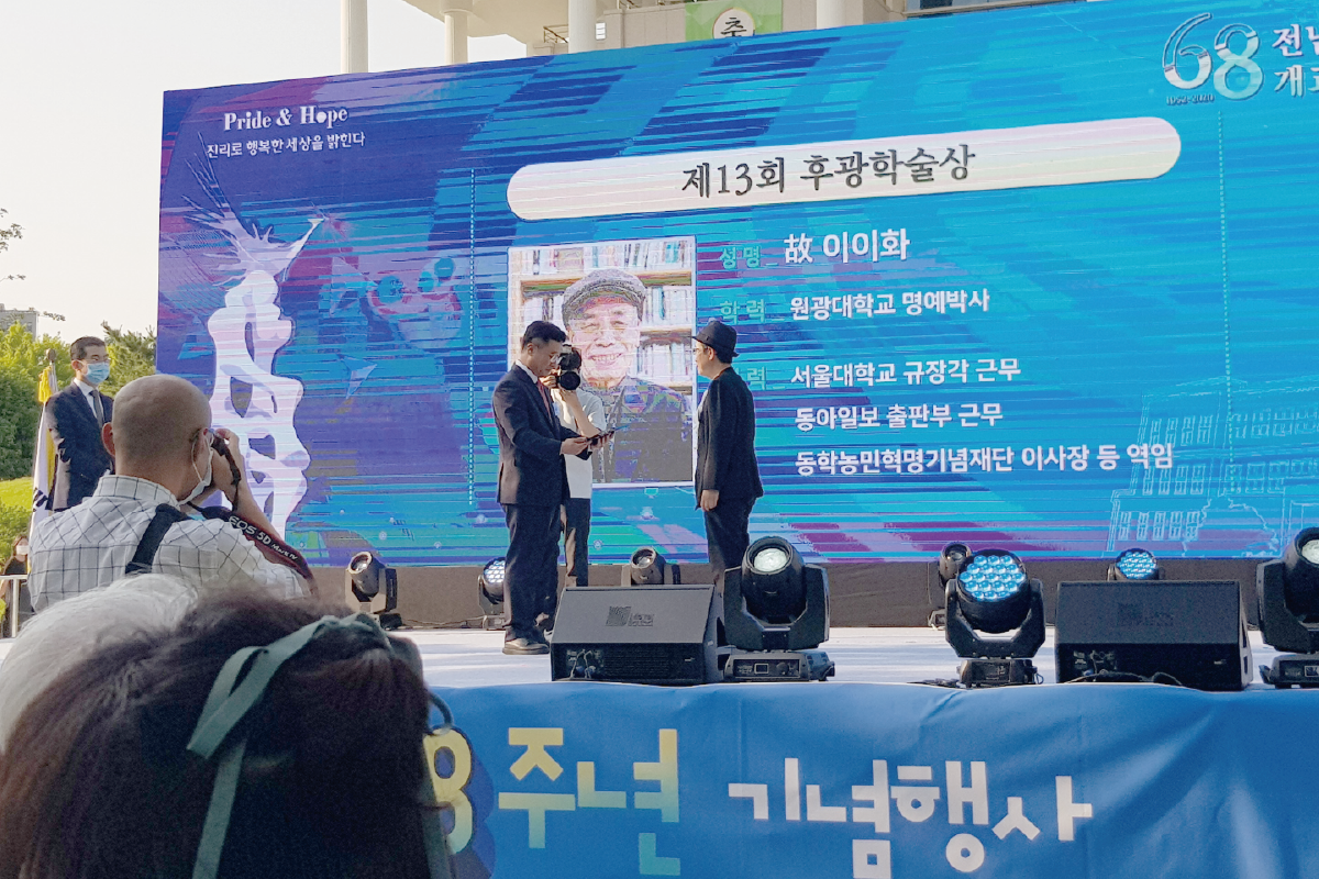 올해로 13회째를 맞은 후광학술상 수상자로 역사학자 고(故) 이이화 선생이 선정되어 지난 6월 8일 전남대 교정 민주마루에서 시상식이 거행되었다. 후광학술상선정위원회(위원장:정일준 고려대 교수)는 “평소 교육과 연구에 정진하면서 민주, 평화, 인권, 정의와 관련된 학술적 업적이 우수하고, 실천적 공로가 지대한 고(故) 이이화 선생을 제13대 후광학술상 수장자로 선정했다.”고 선정 배경을 밝혔다.