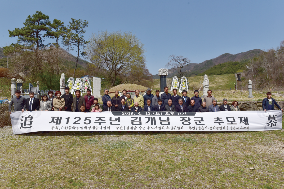 지난 4월 13일, 동학농민혁명 지도자 중 한 사람이었던 김개남 장군의 넋을 기리는 추모제가 정읍시 산외면 동곡리 ‘김개남 장군 묘역’에서 거행되었다. 이날 행사는 (사)동학농민혁명계승사업회(이사장 김영진)가 주최하고, 김개남장군추모사업회추진위원회(대표 손주갑)에서 주관하였다. 이날 추모제에는 유진섭 정읍시장을 비롯하여 심재식 동학농민혁명정읍시유족회 회장 등 내외 귀빈과 많은 지역주민이 참석하여 김개남 장군의 올곧은 기개와 숭고한 애국애족정신을 기렸다.