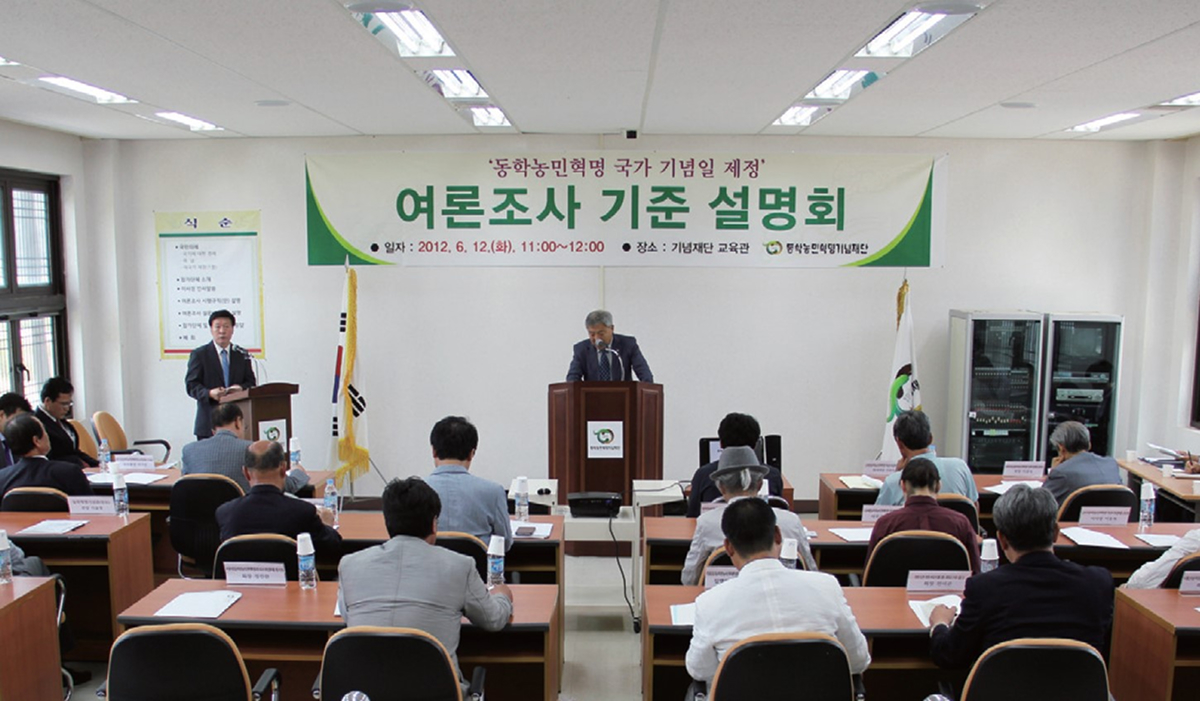 지난 6월 12일(화) 동학농민혁명기념재단에서 동학농민혁명 기념일 제정을 위한 여론조사 기준설명회를 개최하였다. 동학농민혁명 국가기념일 제정이 특정지역의 이기심 때문에 10년 가까이 표류하여 정신선양사업의 발목을 잡고 있는 것이 작금의 상황이다. 이를 타파하고자 재단에서는 5월 7일(월) 운영위원회를 통하여 국가기념일 제정을 대국민 설문조사로서 결정하자는 결론을 내렸으며, 그에 대한 기준설명회를 개최한 것이다.