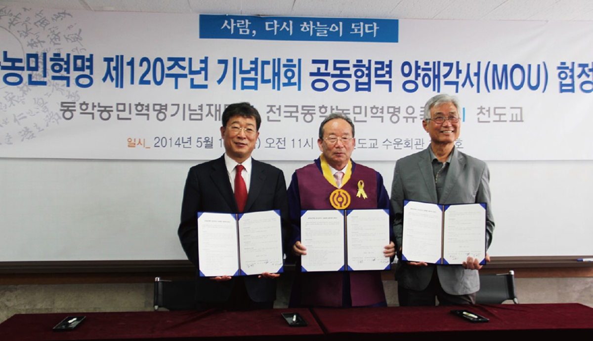 지난 2014년 5월 15일(목)에는 동학농민혁명기념재단, 전국동학농민혁명유족회, 천도교간 동학농민혁명 제120주년 기념대회 공동협력 양해각서(MOU) 협정식이 열렸다. 천도교 수운회관에서 열린 협정식은 세 단체의 단체장들과 관계자들이 참석한 가운데 진행되었으며, 식순 진행과 각 단체장들의 인사 이후 협약을 체결하였다.